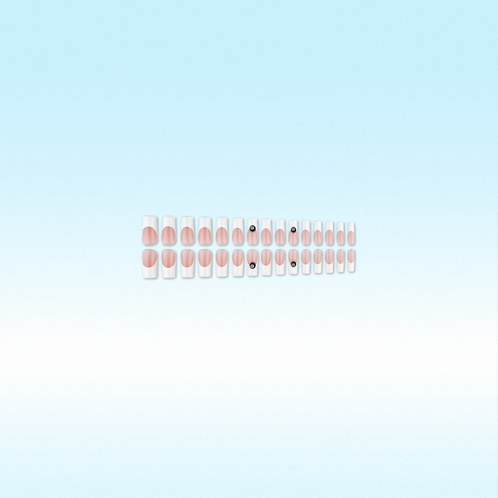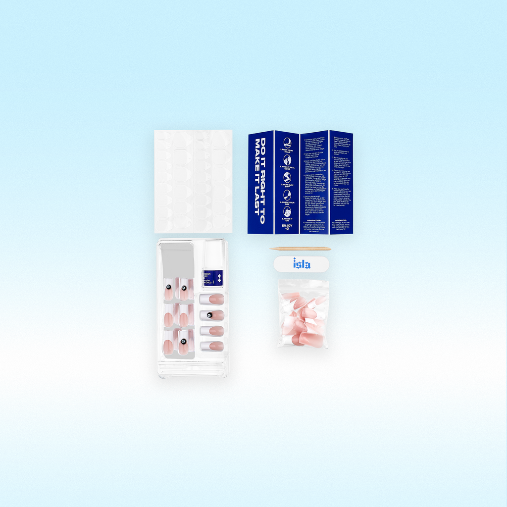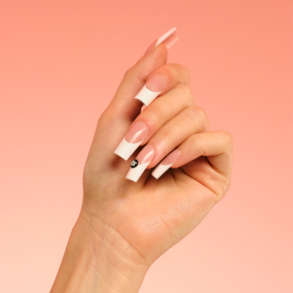 4. Choose your nail sizes and lay them out. Apply the glue evenly to your nails and leave it to dry for 1-2 seconds. For a shorter hold of the Press On Nails, you can place a nail glue pad on the center of your nail instead.